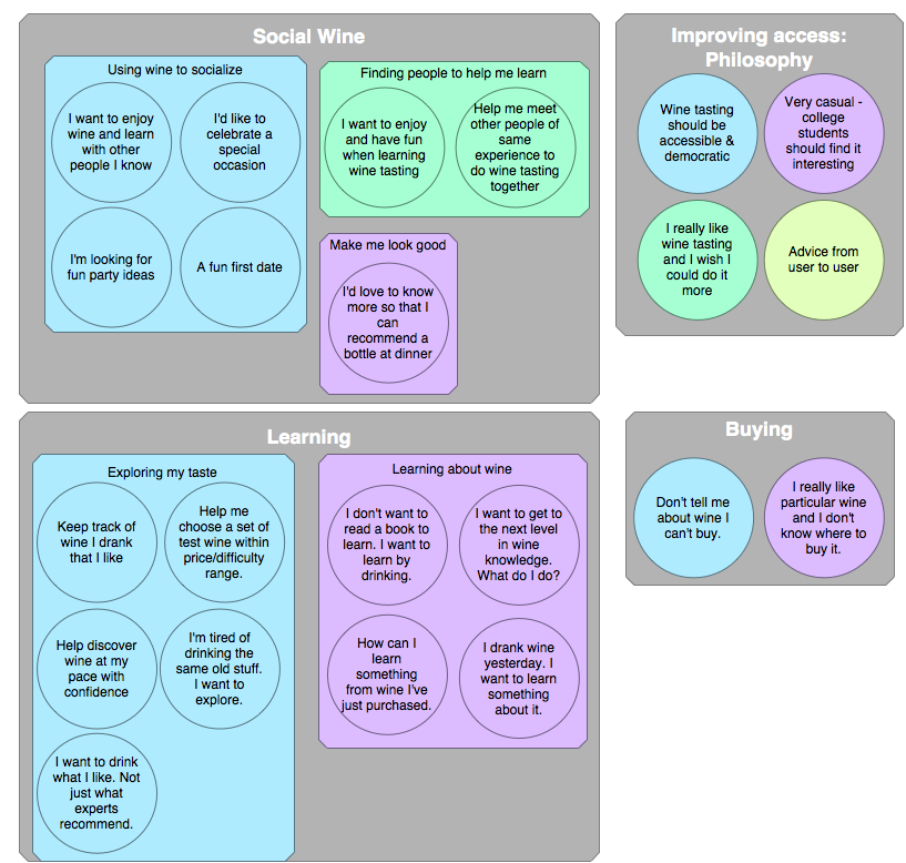 We started with exploratory research to understand currently provided services, areas of opportunity and user needs to guide us through our research. We conducted a quick analysis on competitors' web sites and had a brainstorming session asking ourselves, "What are your desires about wine?" The ideas from our brainstorming session were created into an affinity diagram and we decided to focus on three areas: learning, socializing and making wine more accessible |